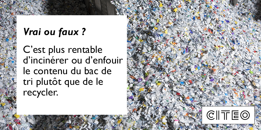 C’est plus rentable d’incinérer ou d’enfouir le contenu du bac jaune plutôt que de le recycler. FAUX